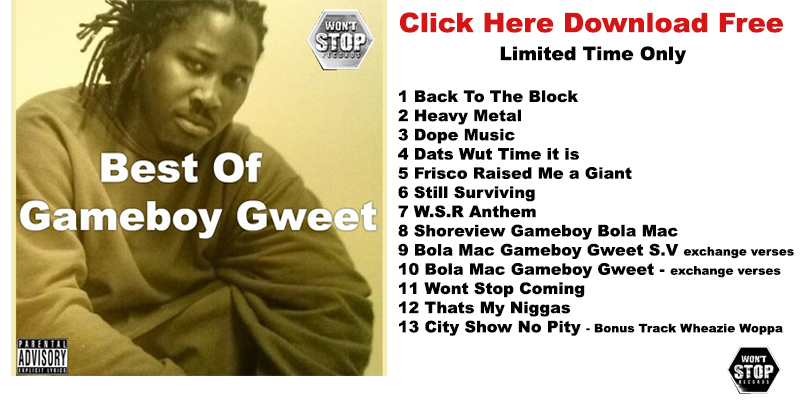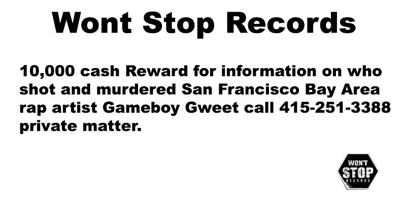 Gameboy Gweet is one of W.S.R most eloquent artist with his effortless rhyme flow and art pattern he will weave you in and out of ghetto urban fairy tales. Gameboy Gweet was shot and killed in Hunters Point San Francisco California on Dec 2nd he was on life suport for two days fighting for his life with a fatal gun shot wound to the head keep Wont Stop Records and the Gameboy imediate family in your prayers. With the lost of Swipe Jones W.S.R has took another huge lost. Gweet music will still be played and celebrated where ever and when ever the W.S.R family is in the Building. W.S.R we love you Gameboy 4 ever...